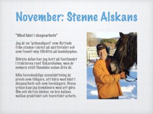 Hösten lämpar sig bra för fysiskt arbete i skogen med lagom arbetstemperatur och utan insekter som plågar hästarna. Jag vill också upplysa om att det finns en förening som heter ”Sveriges hästkörare” med tusen medlemmar och som ger ut en tidskrift ”Moderna hästkrafter”.